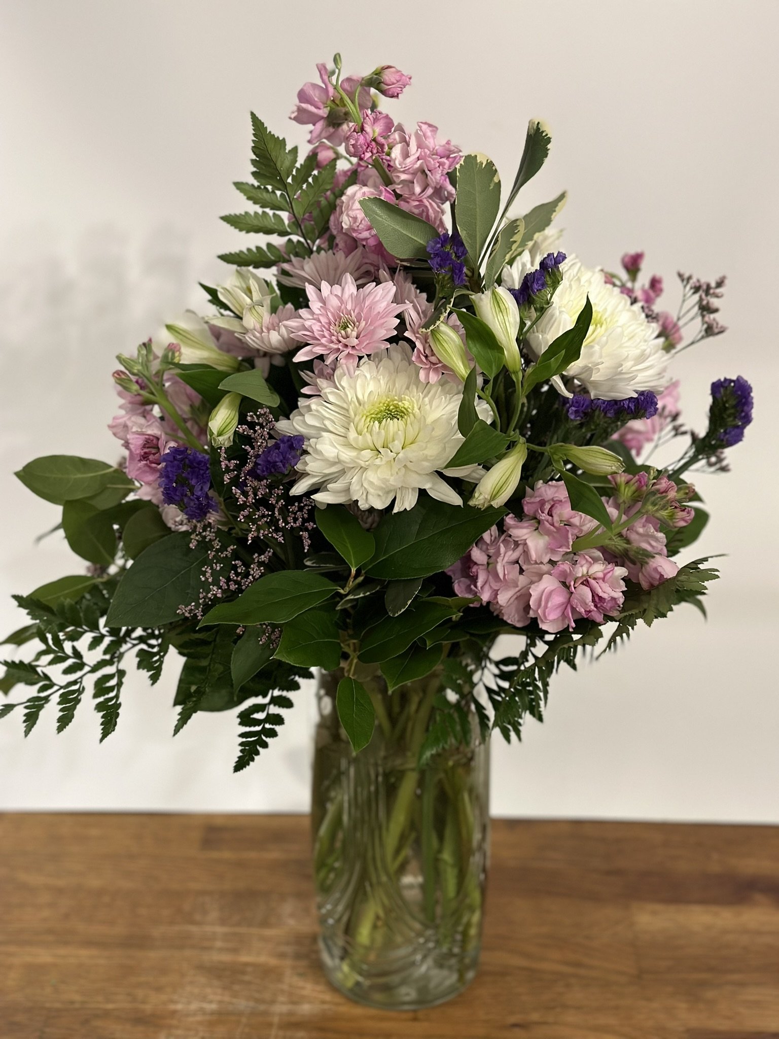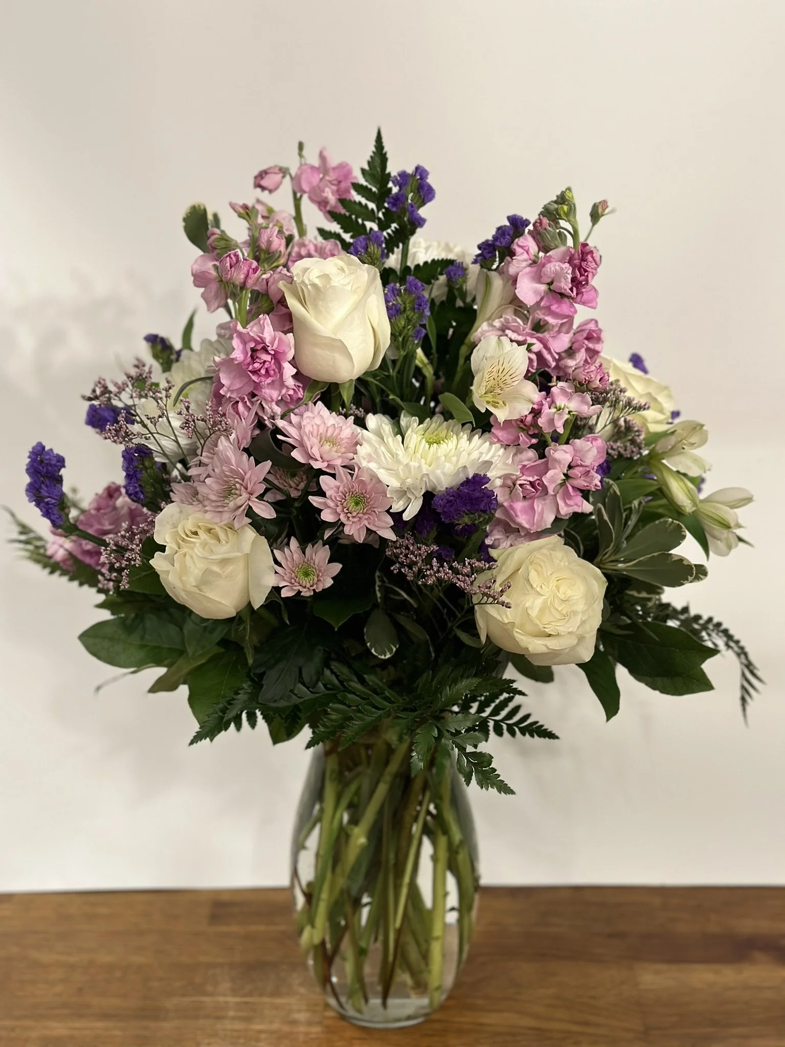 Dive into a playful burst of pastels with our 'Pastel Party Posy.' Pink stock, white chrysanthemums, purple statice, and alstroemeria come together in a fun, flirty mix that's sure to spread smiles. Roses are included in the deluxe and premium versions.