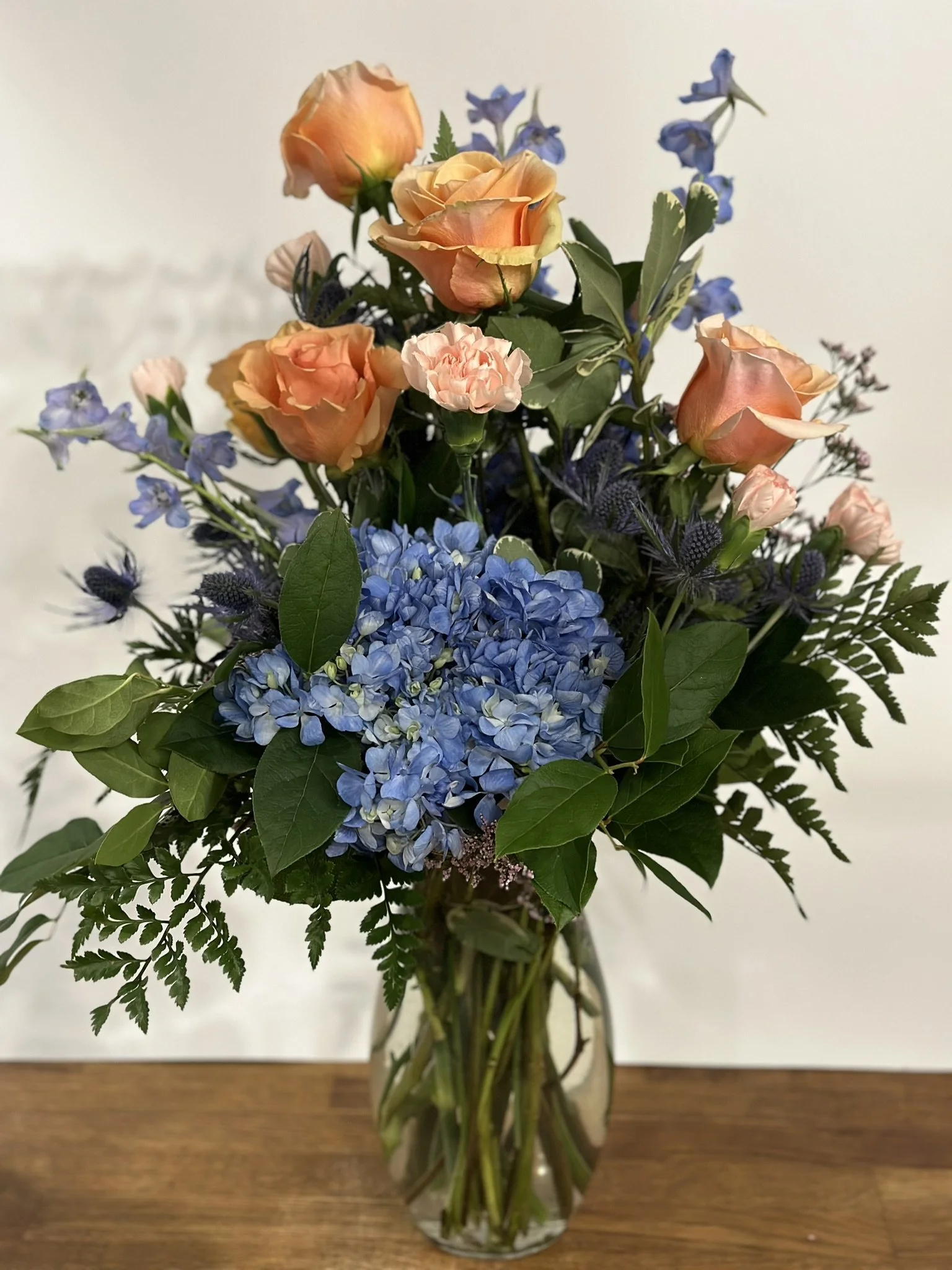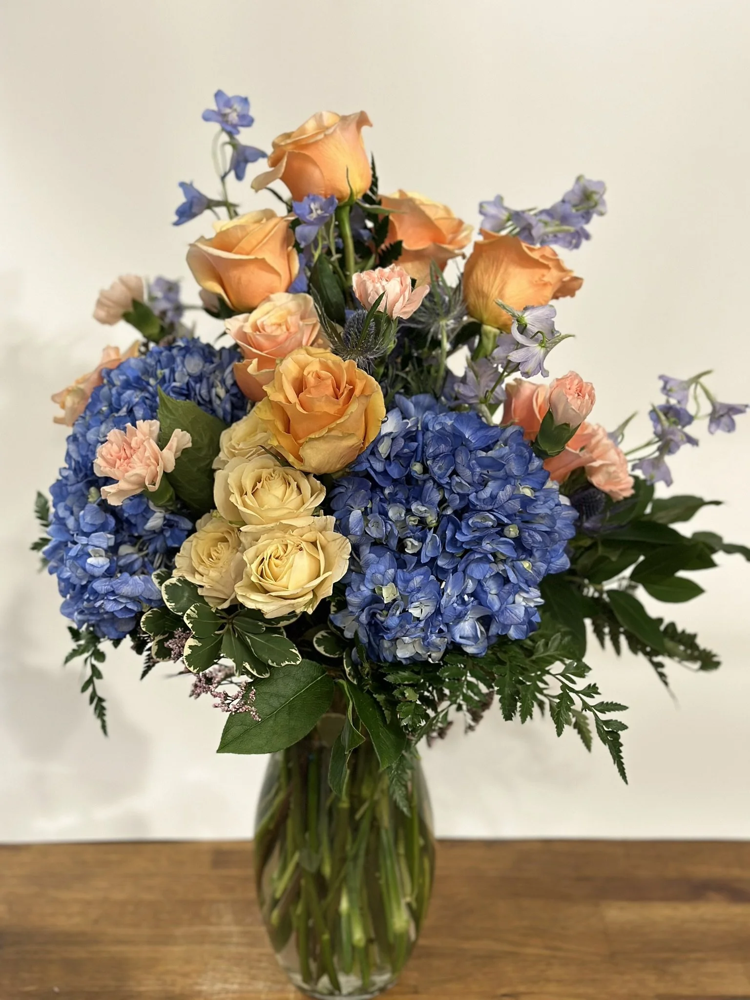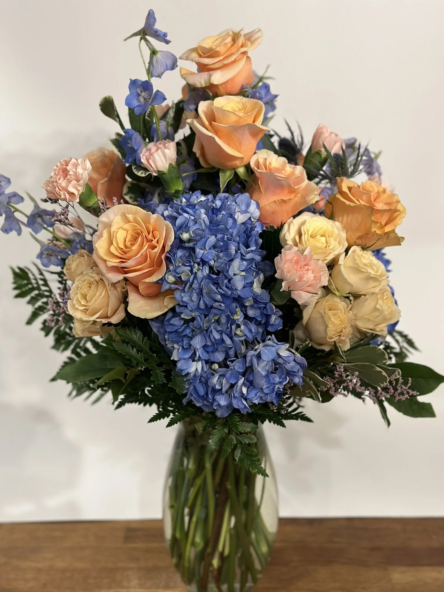 Peach roses and carnations with a splash of blue hydrangea and delphinium.