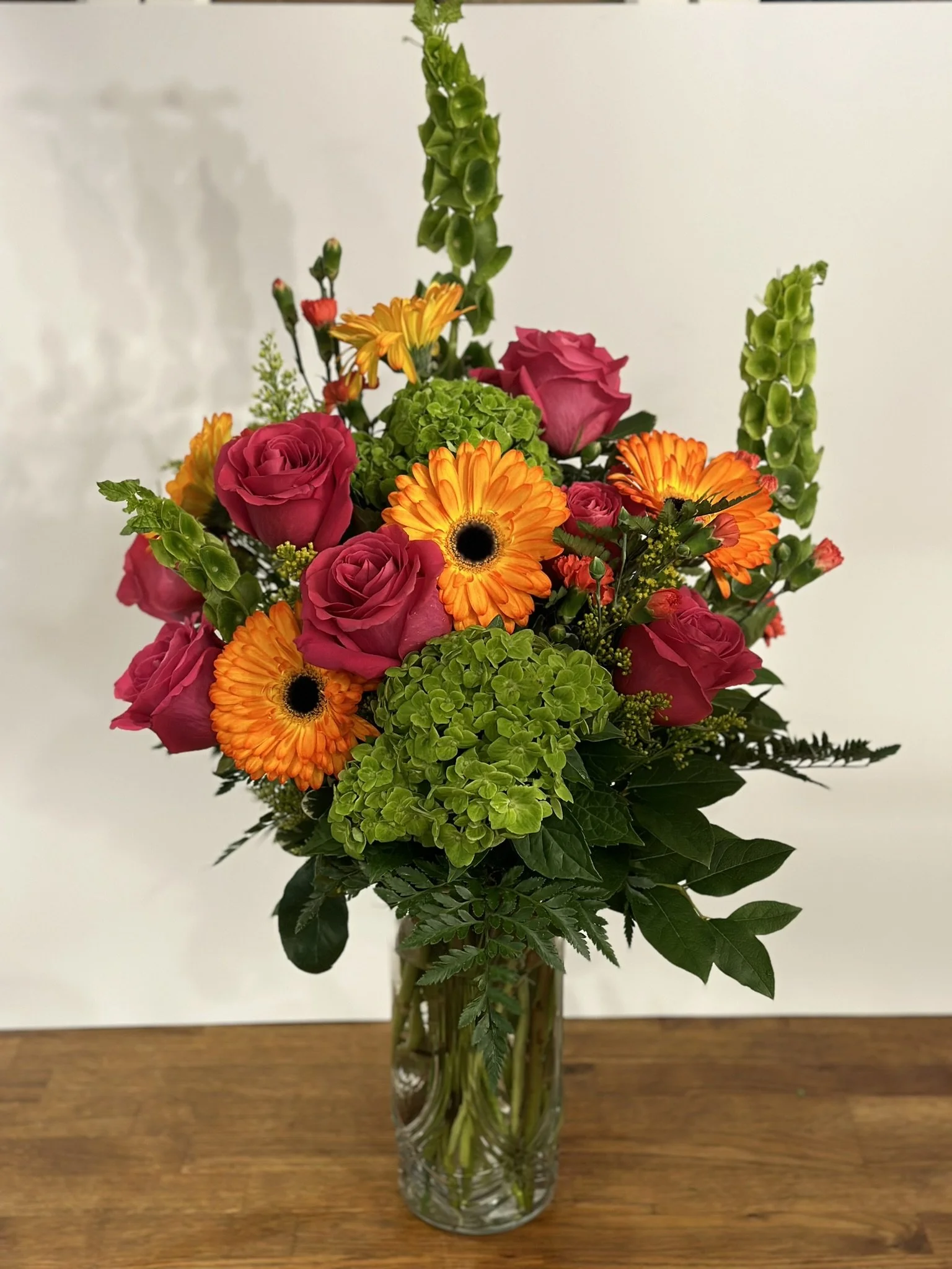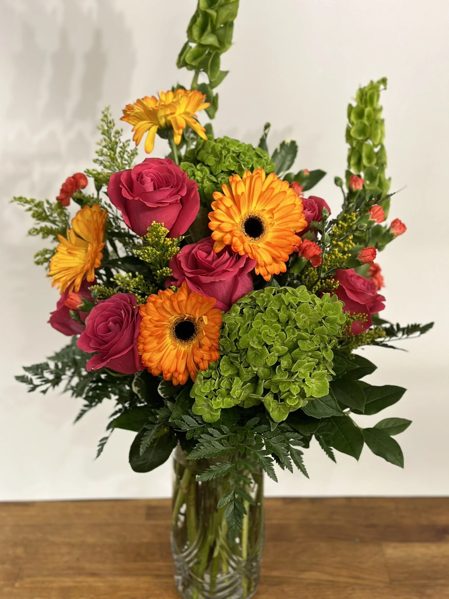 This lively arrangement features hot pink roses, lush green hydrangeas, and vibrant orange gerbera daisies. It's a refreshing blend of colors reminiscent of your favorite summertime treat, perfect for brightening any occasion or space with a burst of joy and style.