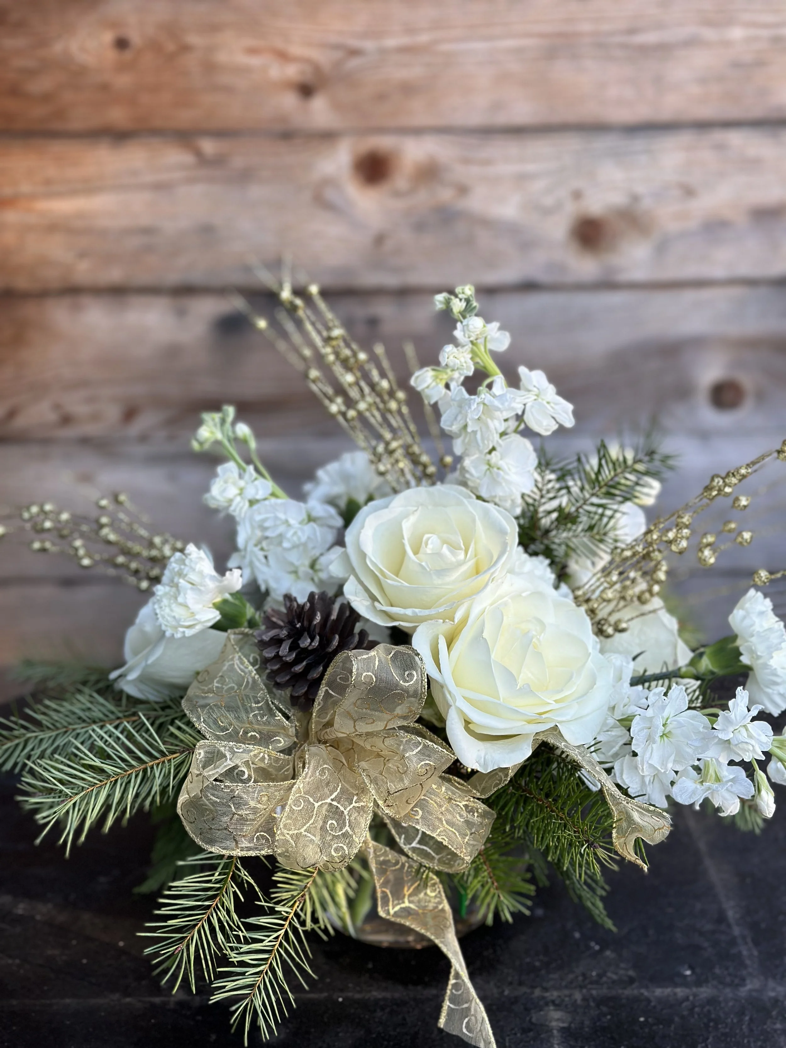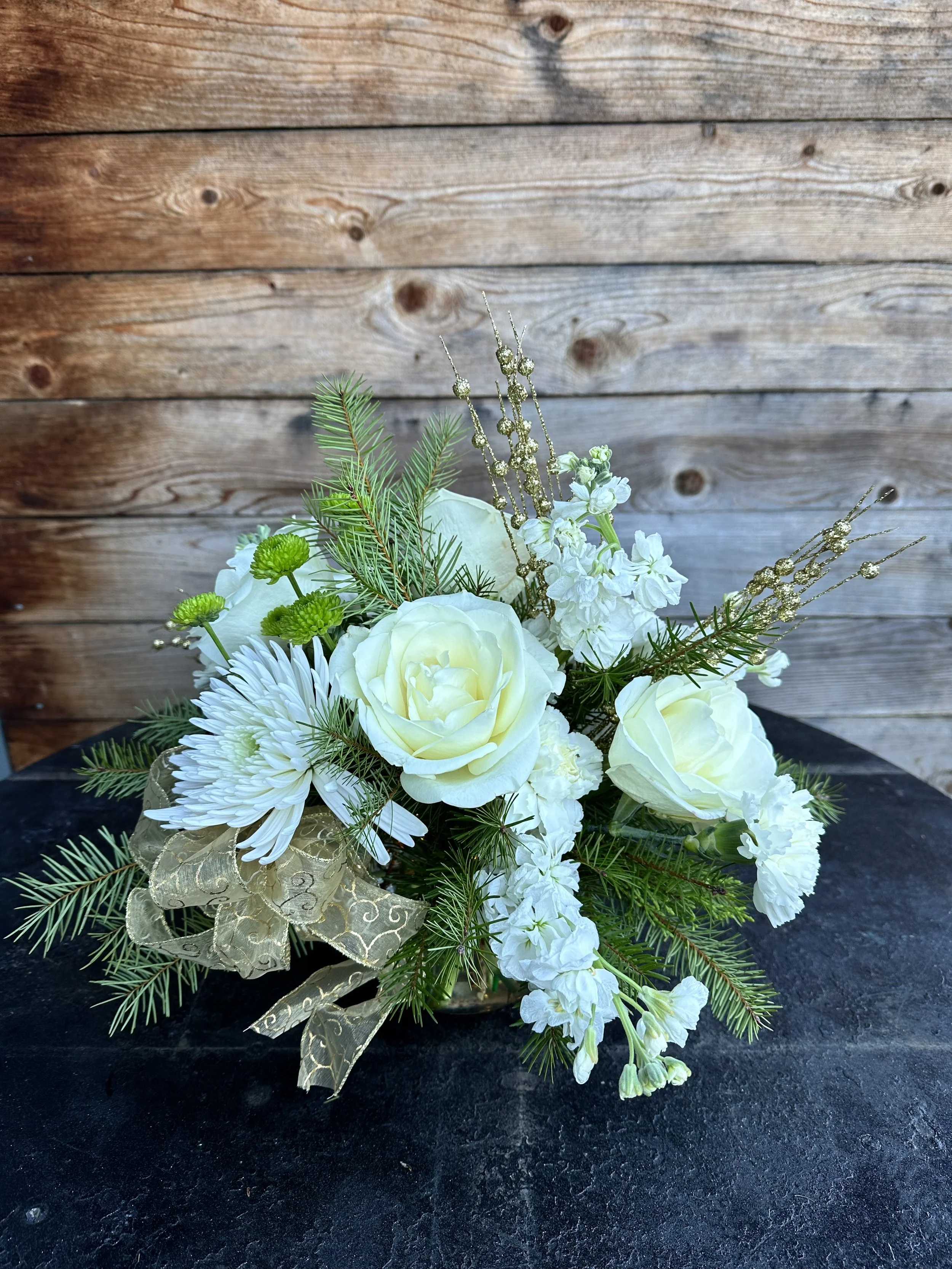Step into a holiday fairytale with our 'Winter Wink' arrangement – where each bloom tells a story of winter's magic, and the lights... oh, the lights make it a tale to remember.